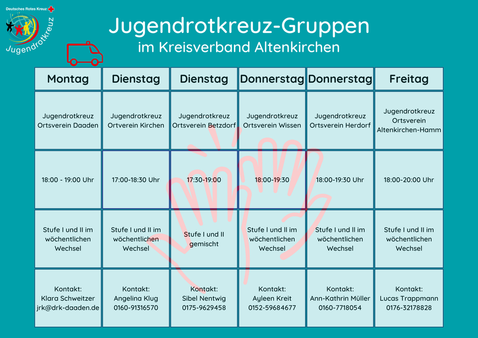 Den Ansprechpartner findest Du oben rechts in der Service-Spalte oder wende dich direkt an ein Jugendrotkreuz in Deiner Nähe. Wo unsere Standorte sind findest du auf der u. a. Liste.